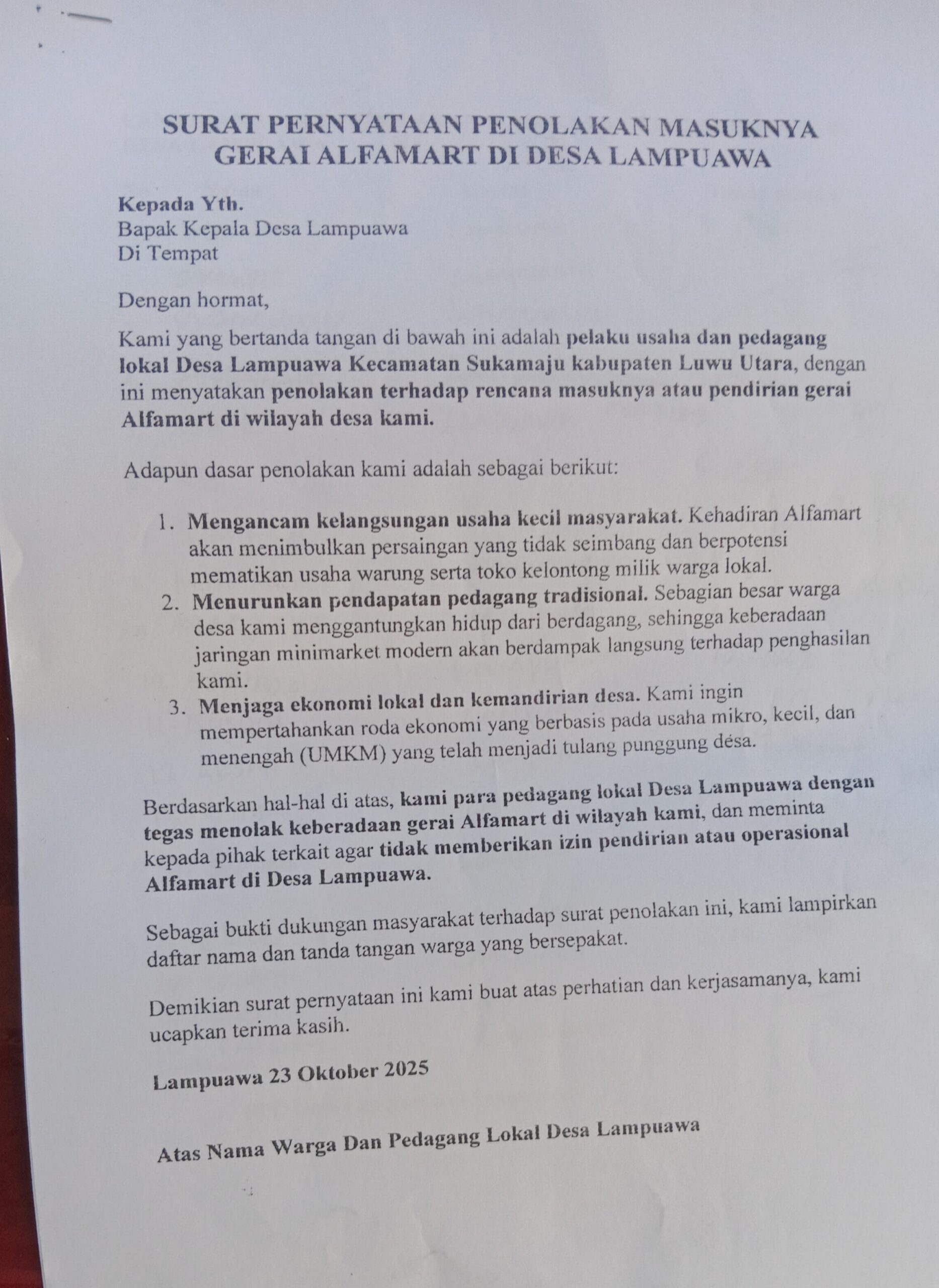Warga Desa Lampuawa Tolak Rencana Pembangunan Retail Modern Alfamart di Wilayahnya